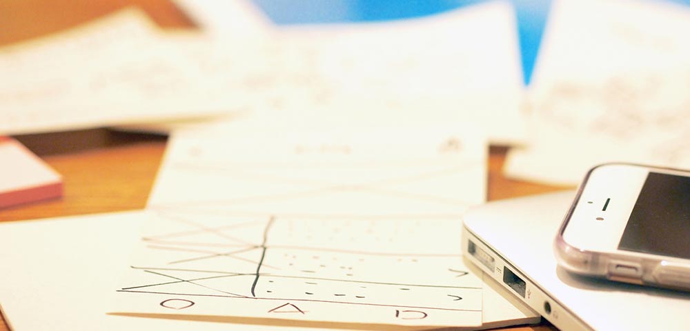 4.設計・評価シナリオを元に画面レイアウトや遷移の流れを複数パターン出しして、紙や専用ツールで試作を行います。 実際に触りながら評価・修正を繰り返し、お客様と共に「形」を見出していきます。 -